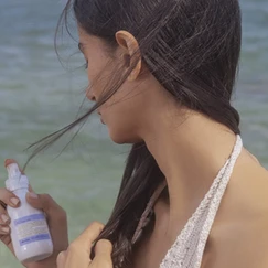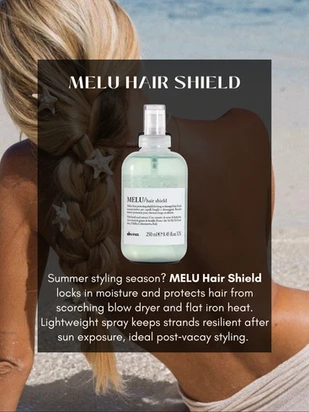 Melu Hair Shield Your summer styling shield. A must-have for anyone using hot tools, this spray protects hair from blow dryer and flat iron damage while maintaining softness and strength.