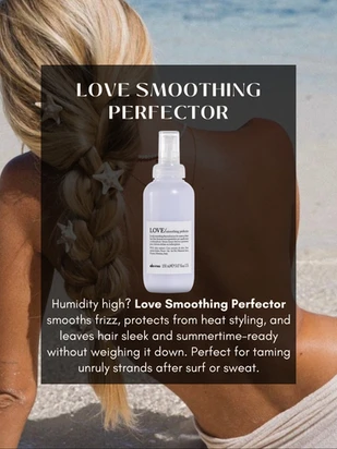 Love Smoothing Perfector Humidity’s worst enemy. This lightweight leave-in treatment smooths frizz, adds shine, and provides heat protection without weighing your hair down. Perfect for sleek styles that still feel touchable.